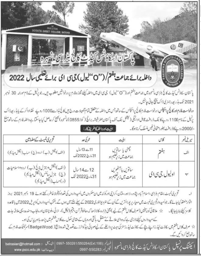 Interested students can apply to Pakistan Scouts Cadet College Batrasi Mansehra for admission in the 8th class and GCSE O Level for the year, online or on campus. All documents related to the admission process are submitted to the Principal of the college.